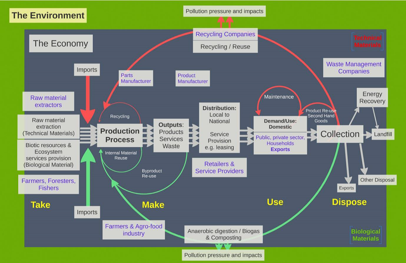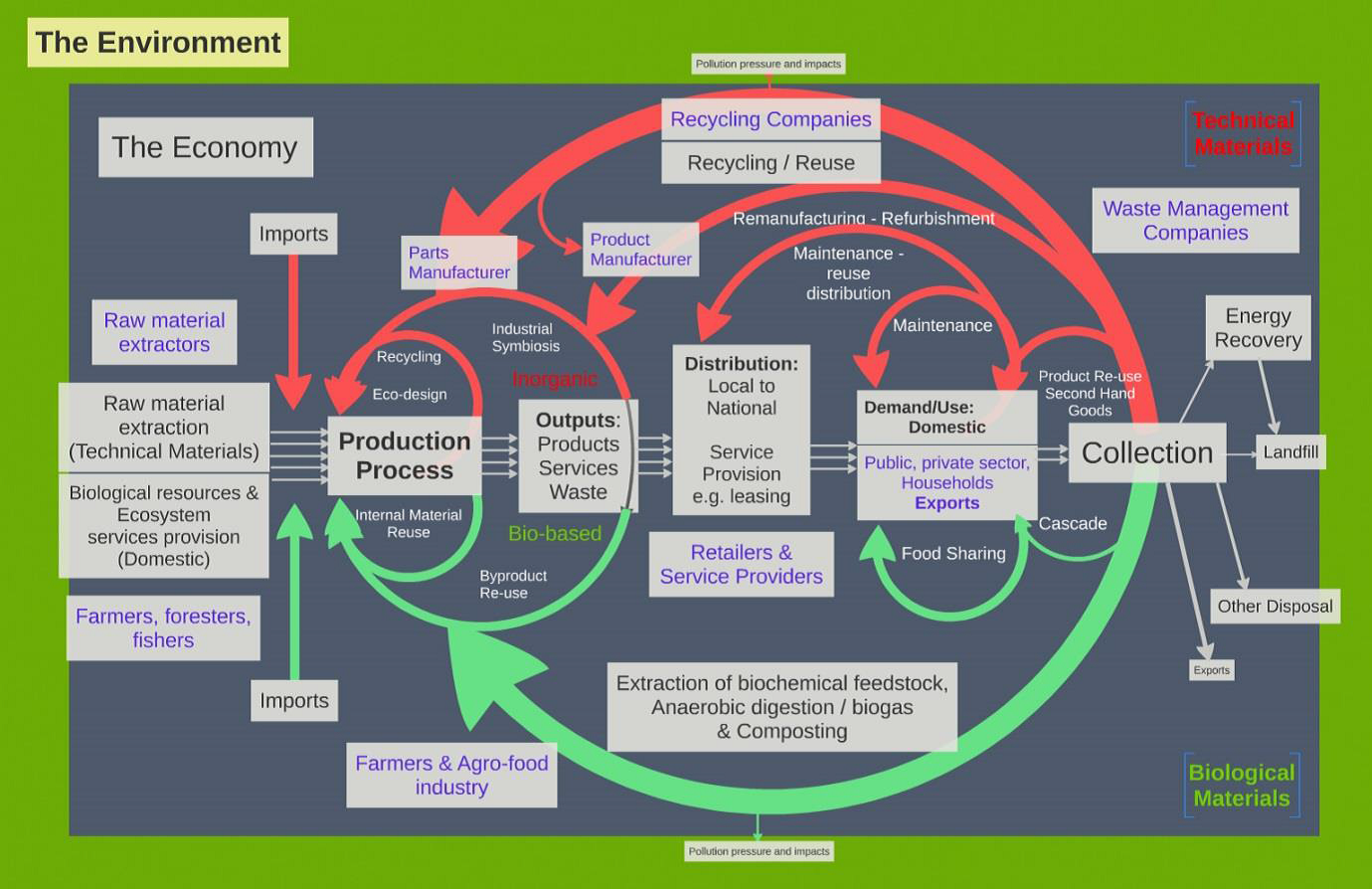 Oběhové hospodářství nabývá v politických a ekonomických programech rychle na významu. Na rozdíl od současného převážně lineárního hospodářství "vezmi – vyrob – použij – vyhoď" představuje oběhové hospodářství strategii rozvoje, která umožňuje hospodářský růst s cílem optimalizovat řetězec spotřeby biologických a technických materiálů. Předpokládá se hluboká transformace výrobního řetězce a schémat spotřeby, aby materiály zůstaly v ekonomice déle v oběhu, nová koncepce průmyslových systémů a podpora kaskádového využití materiálů a odpadů. I když v lineárním hospodářství existují některé oběhové prvky, jako například recyklace a kompostování (viz obr. E1), kde je třeba zajišťovat pokrok, oběhové hospodářství jde nad rámec snahy o předcházení vzniku odpadů a snižování jejich množství a dává podněty k technologickým, organizačním a sociálním inovacím napříč a podél hodnotových řetězců (viz obr. E2). Již jsou uplatňovány mnohé politiky a aktivity, které oběhové hospodářství podporují, ovšem zbývá ještě celá řada nevyužitých příležitostí, nákladů, které bude třeba ušetřit a překážek, které bude třeba překonat, aby se urychlil pohyb směrem k oběhovému hospodářství v EU.