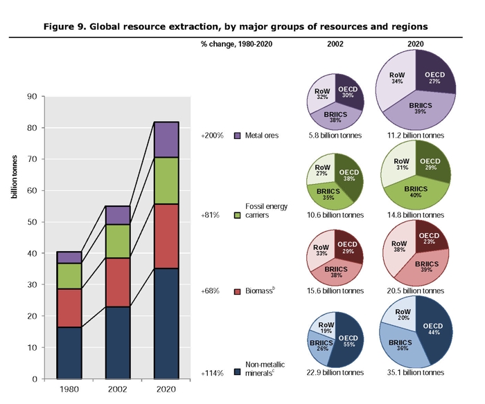 Světová těžba přírodních zdrojů zahrnující nerosty, kovy, paliva, biomasu vzrostla ze 40 mld. tun v roce 1980 na 55 mld tun v roce 2002 s výhledem na 82 mld. tun v roce 2020. Velká část surovin nezbytně důležitých pro hi-tech výrobu, včetně elektronického průmyslu se těží jen v několika málo zemích. Například Čína těží 97% všech prvků vzácných zemin, nezbytných pro výrobu elektronických zařízení a čínská vláda uplatnila restriktivní politiku na export. Trvale také narůstá světová spotřeba energetických surovin (uhlí, ropa, zemní plyn), při čemž dochází k mezinárodním konfliktům pramenících z jejich omezené dostupnosti. Zatímco chudé a vynořující se ekonomiky suroviny především těží a vyvážejí, na straně průmyslově vyspělých zemí převládá výrazně jejich dovoz a spotřeba.
