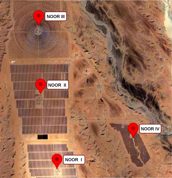 Komplex se skládá z projektů Noor I až Noor IV. Noor I a Noor II jsou projekty typu Parabolic through CSP, Noor III je projekt CSP Tower a Noor IV je fotovoltaický projekt.