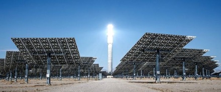 Sluneční světlo z heliostatů ohřívající roztavenou sůl v centrální věži